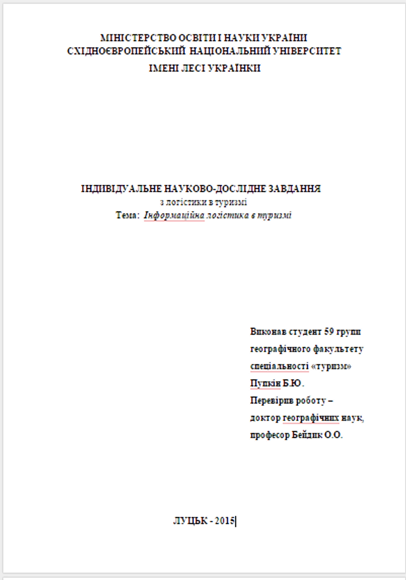 Нумерацію сторінок, параграфів, рисунків, таблиць, формул подають арабськими цифрами без знака №. Номер сторінки ставлять у правому верхньому кутку сторінки без крапки в кінці. Такі структурні частини реферату як зміст, вступ, висновки, список використаних джерел не мають порядкового номера. Всі розрахунки і формули, що використовуються, повинні супроводжуватись необхідними поясненнями. Кожна таблиця, схема, діаграма, графік повинна мати назву, посилання на джерела їх використання, одиниці виміру величин і бути пронумерованими. Правила оформлення ілюстрацій, таблиць та формул Ілюстрації (фотографії, креслення, схеми, графіки, діаграми, карти) і таблиці слід подавати у параграфі практики безпосередньо після тексту, де вони згадані вперше, або на наступній сторінці. Ілюстрації і таблиці, розміщені на окремих сторінках реферату , включають до загальної нумерації сторінок. ДОДАТОК А Зразок оформлення титульного листа ПВНЗ «КИЇВСЬКИЙ УНІВЕРСИТЕТ КУЛЬТУРИ» ФАКУЛЬТЕТ ГОТЕЛЬНО-РЕСТОРАННОГО І ТУРИСТИЧНОГО БІЗНЕСУ КАФЕДРА МІЖНАРОДНОГО ТУРИЗМУ РЕФЕРАТ з дисципліни «Вступ до фаху» за темою назва теми Виконав: Студент групи ____________________ шифр групи ____________ ____________________ (Підпис) Прізвище, ініціали Науковий керівник ___________ _____________________ (Підпис) Прізвище, ініціали, вчене звання Київ – 2018 ДОДАТОК Б (ЗРАЗОК) ВСТУП На сучасному етапі обов’язковою умовою забезпечення стабільного економічного розвитку будь-якого підприємства виступає всебічне удосконалення системи управління, що зумовлює безперервне загострення конкуренції на внутрішньому і зовнішніх ринках, глобалізацію економічних відносин, прискорення науково-технічного прогресу.