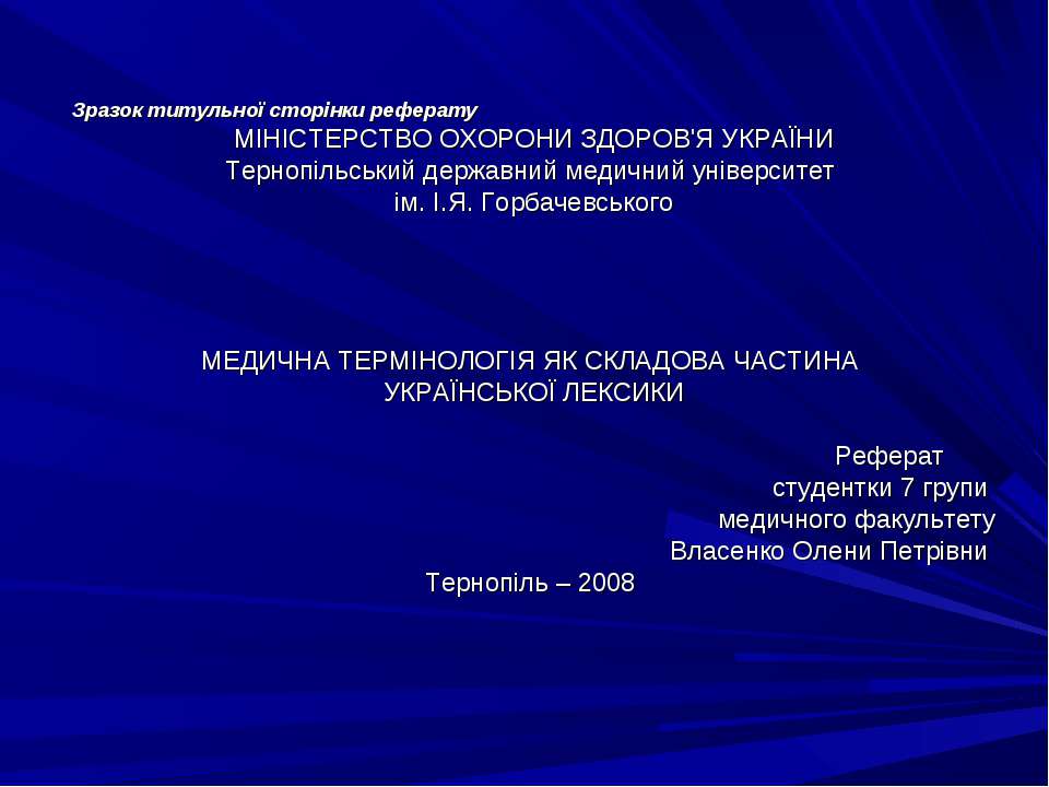 СТРУКТУРА ТА ЗМІСТ РЕФЕРАТУ Реферат обсягом 5-7 сторінок має бути надрукований (написаний) на окремих аркушах паперу формату А4, пронумерований та переплетений. Реферат повинен містити: титульну сторінку зміст вступ основну частину висновки список використаних джерел Титульну сторінку потрібно подати у друкованому вигляді і оформити за зразком (ДОДАТОК А). Зміст подають на початку реферату з найменуванням та номерами початкових сторінок усіх параграфів зокрема, вступу, висновків, додатків тощо. У вступі (обсяг 1сторінка) потрібно обґрунтувати мету та основні завдання дослідження (ДОДАТОК Б). Зразок змісту (ДОДАТОК В). Основна частина реферату передбачає поглиблений розгляд визначених параграфі, які розкриваються відповідно до складеного змісту. Кожен параграф починають із нової сторінки. Наприкінці реферату студент повинен зробити загальні висновки (обсяг 1 сторінка): підвести підсумки дослідження. У кінці наводять список використаних джерел.