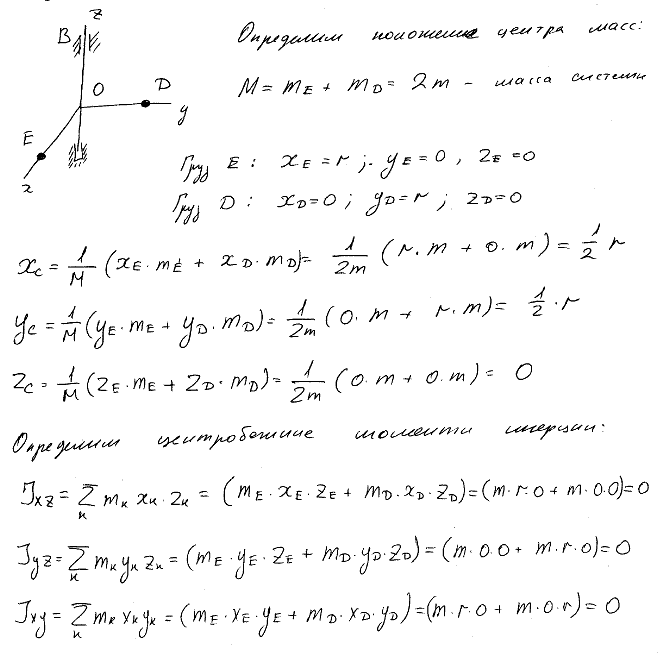 2. Мяч массой 100 г, m 1 , и шар массой 200 г, m 2 , соединенные стержнем длиной 60 см. Массой стержня пренебрегаем. Ось вращения расположена в центре стержня. Чему равен момент инерции шариков относительно оси вращения?