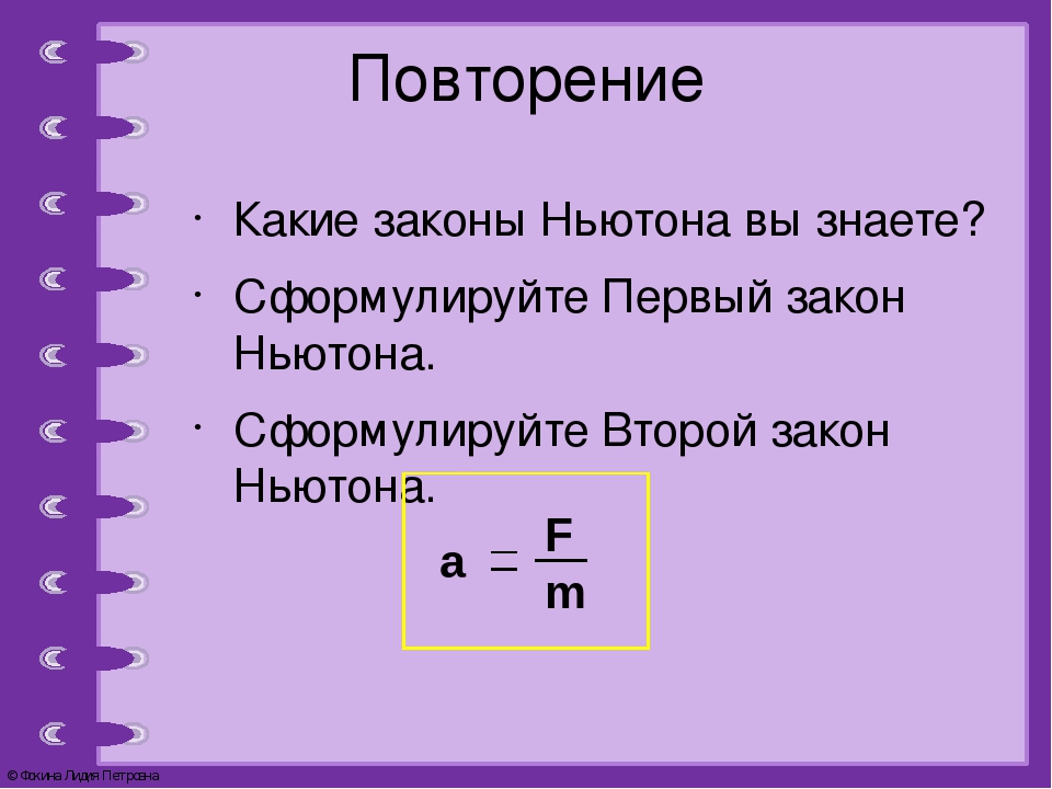 объект в движении будет оставаться в движении, если на него не действует другая сила.F=ма. Ньютон 2-й Закон . ньютон секунды закон . Сила равна произведению массы на ускорение. ускорение. Скорость изменения скорости. трение.
