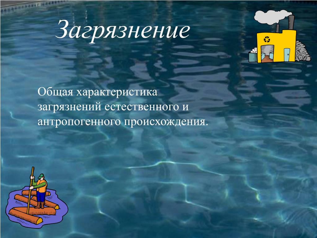 Главными источниками загрязнения являются промышленность, транспорт, сельское хозяйство, коммунальное хозяйство. В загрязнении вод наиболее велика доля промышленности, в особенности предприятий черной и цветной металлургии, энергетики, нефтепереработки и нефтехимии, деревообрабатывающей и целлюлозно-бумажной промышленности. Сельское хозяйство, являясь крупным источником загрязнения, сбрасывает во внутренние водоемы химические удобрения, ядохимикаты, отходы животноводческих ферм. Водный транспорт сбрасывает в реки и озера большое количество отходов и нефтепродуктов. Загрязнение делят на физическое, химическое и биологическое. К физическому загрязнению относят загрязнение твердыми отходами – мусором, потерями леса при молевом сплаве. Такое загрязнение не создает опасности для живых организмов, но затрудняет работу транспорта, рыболовства и ухудшает качество ландшафта.Химическое загрязнение вызывает попадание в водоемы кислот, щелочей, тяжелых металлов, удобрений, пестицидов, фенолов, нефти и нефтепродуктов.
