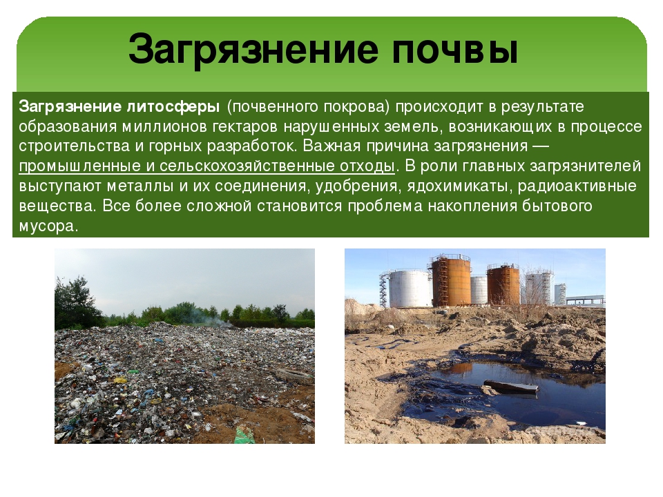 Загрязнение почв — также происходит в любых масштабах, начиная от невыброшенной пластиковой бутылки и заканчивая попаданием в почву ртути из батареек или энергосберегающих ламп.