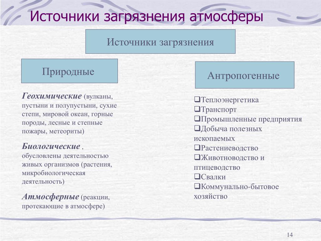По причинам возникновения источники загрязнения подразделяют на антропогенные и естественные.