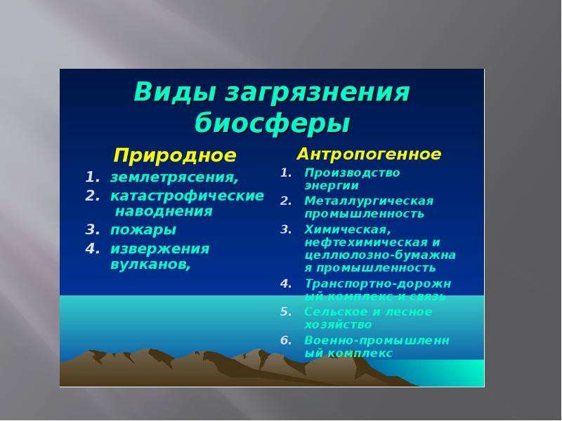 Выделяют естественное и антропогенное загрязнение: