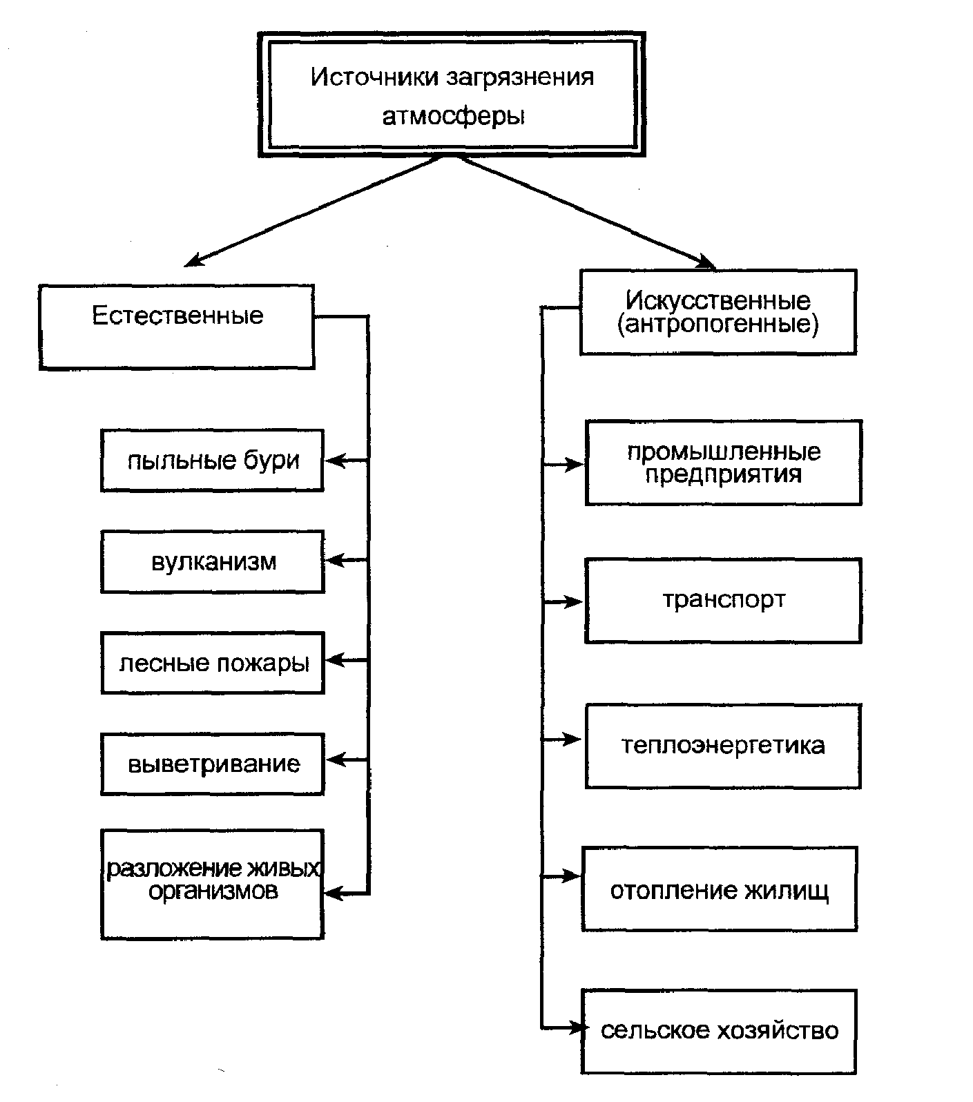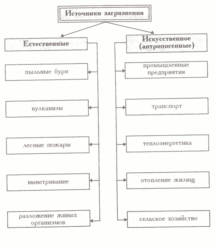По происхождению выделяют естественное загрязнение, возникшее в результате мощных природных процессов (извержения вулканов, лесных пожаров, выветривания и пр.), без какого-либо влияния человека; и антропогенное, являющееся результатом деятельности человека, иногда по масштабам воздействия превосходящее естественное. Различные типы загрязнения подразделяются на три основных: химическое, физическое и биологическое (рис.