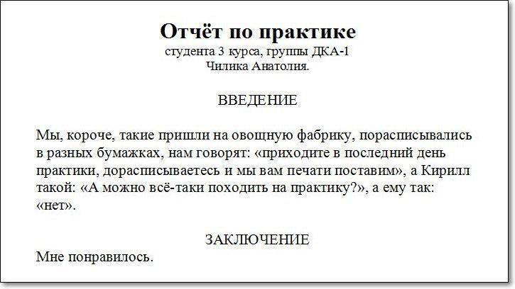 Читая отчет по практике, преподаватели должны понимать, что узнал и чему научился студент. Поэтому этот раздел должен содержать больше конкретной информации с профессиональными терминами, художественное оформление должно содержаться в минимальном количестве. Ниже приведен пример заключения, которое писать не стоит.
