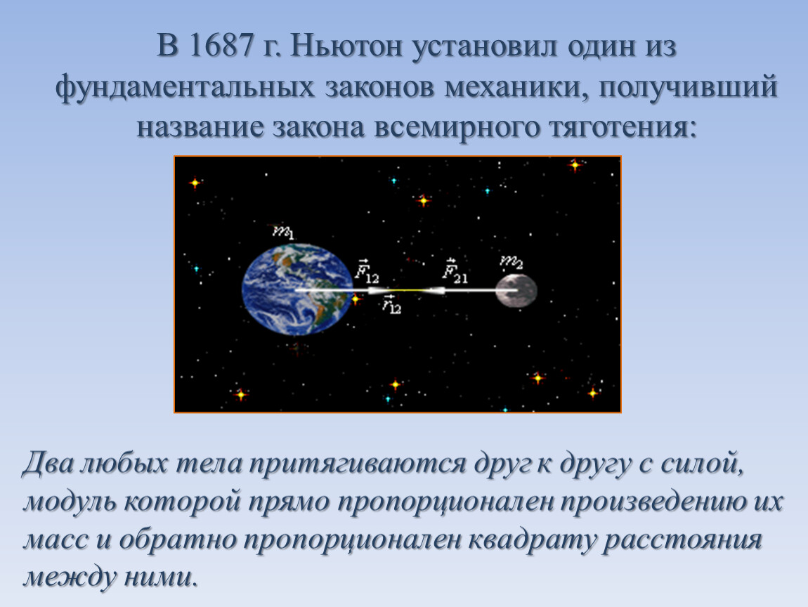 Закон всемирного тяготения является важнейшим принципом физики. Впервые он был записан сэром Исааком Ньютоном в 1600-х годах. Закон всемирного тяготения гласит, что все объекты притягиваются друг к другу под действием силы тяжести; сила притяжения зависит от массы объектов и уменьшается в зависимости от расстояния между ними. Открытие Ньютона было заменено теорией общей теории относительности Эйнштейна. Это все еще точно, однако, для большинства практических применений.