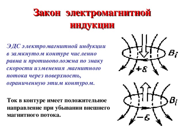 Оказывается существует правило Ленца – русского ученого, который проводил свои исследования, основываясь на постулатах Фарадея. По Ленцу знак «-» указывает на направление возникающей ЭДС, т.е. индукционный ток направлен так, что магнитный поток, который он создает, через площадь, ограниченную контуром, стремится препятствовать тому изменению потока, которое вызывает данный ток.