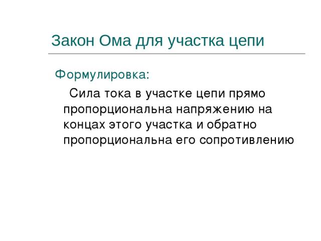 Закон Ома для участка цепи гласит: ток прямо пропорционален напряжению и обратно пропорционален сопротивлению