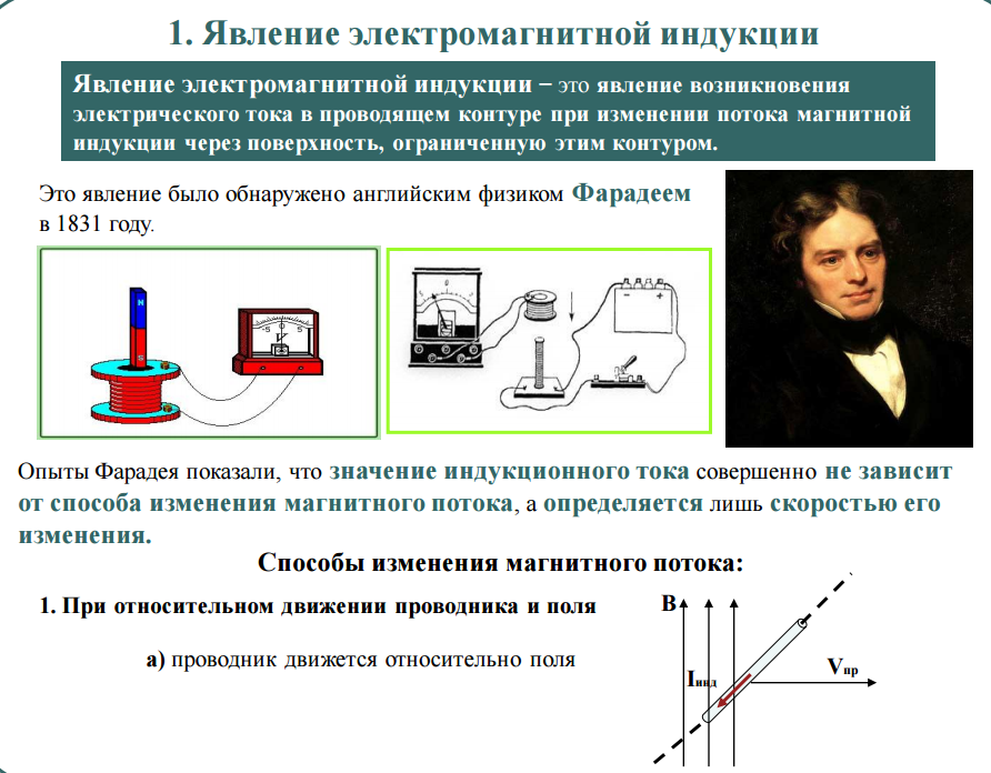 Но настоящим прорывом в науке об электричестве и магнетизме стало открытие Майклом Фарадеем явления электромагнитной индукции — возникновение электрического тока в замкнутом контуре при изменении магнитного потока, проходящего через него. Независимо от Фарадея явление электромагнитной индукции было также открыто Джозефом Генри в 1832 году, попутно открывшим явление самоиндукции.