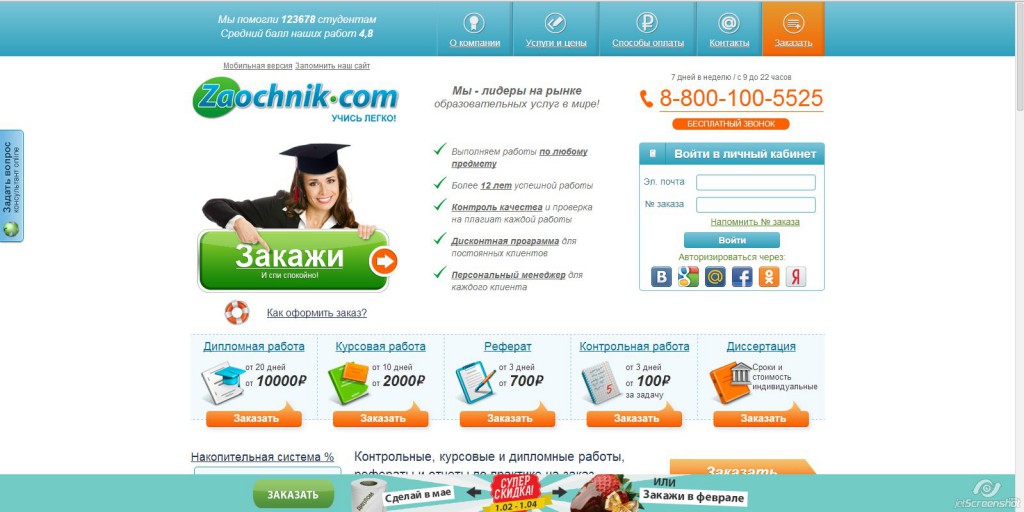 Дальше идет меню, в котором все просто: цены и сроки, способы оплаты, Отзывы, О компании и контакты. А на главной странице можно узнать полезную информацию об этом сервисе, как он работает, а также приблизительно можно вычислить стоимость работы, которую ты хочешь заказать. Какие гарантии и ответственность.