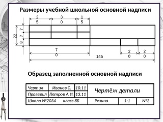 100]На рис. 5 приведен пример заполнения основной надписи на учебном чертеже. Размер шрифта для текста в основной надписи рекомендуется принять для граф 1,2 и 26—7 для граф 4, 5, 6 и 9—5 для всех остальных граф — 3, 5.