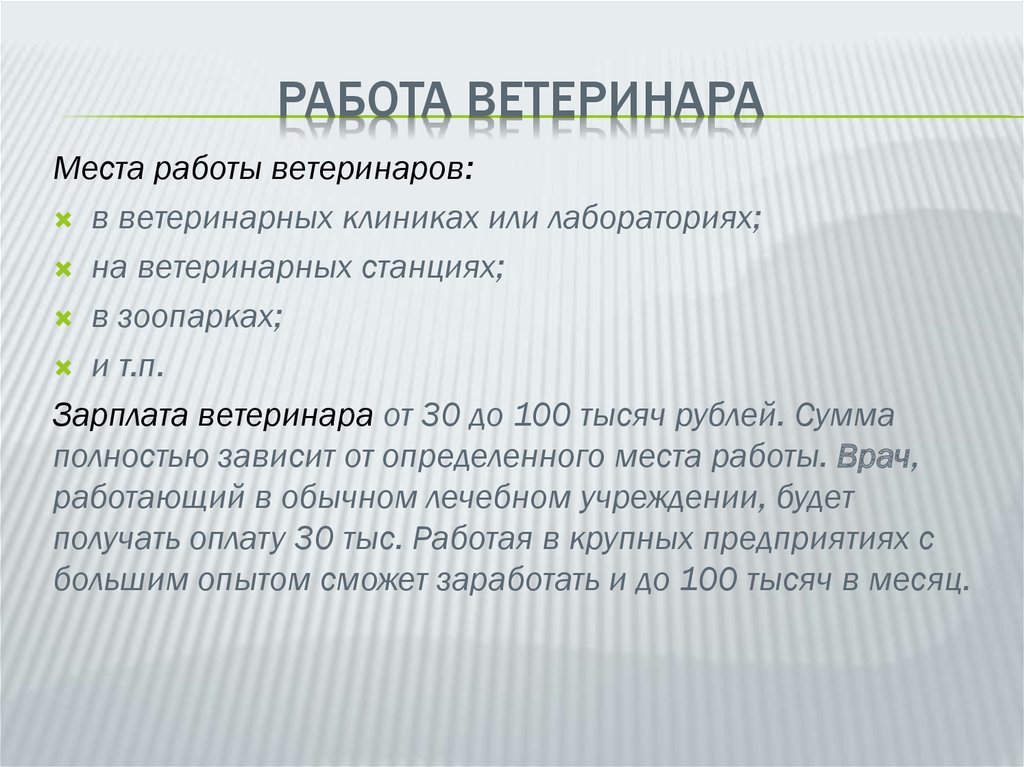 - Средний уровень: проработав несколько лет в ветеринарии, доктора начинают получать зарплату, близкую к средней по стране, на уровне 84555 долларов в год.