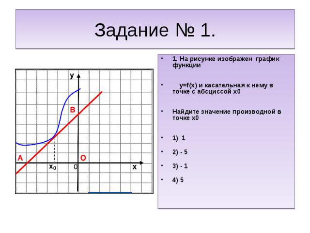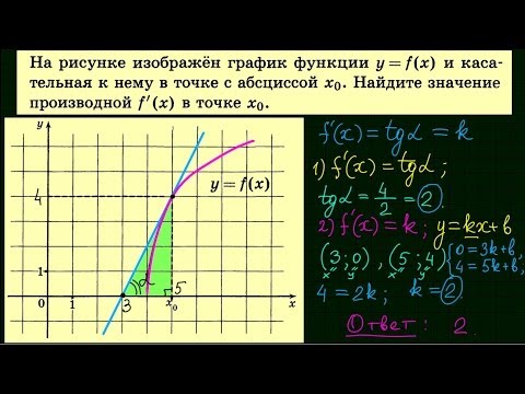 Производная функции в точке равна тангенсу угла наклона касательной, проведённой к графику функции в этой точке.
