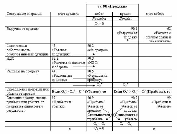 По окончании каждого месяца сопоставляются обороты по указанным субсчетам: сумма дебетовых оборотов по субсчетам 90.2, 90.3 и др. сопоставляется с общим кредитовым оборотом по субсчету 90.1. Разница представляет собой прибыль или убыток от продаж за текущий месяц. Эта сумма записывается заключительной датой месяца по дебету счета 90.9 и кредиту счета 99 «Прибыли и убытки» (в случае прибыли) или по дебету счета 99 «Прибыли и убытки» и кредиту счета 90.9 (в случае убытка).