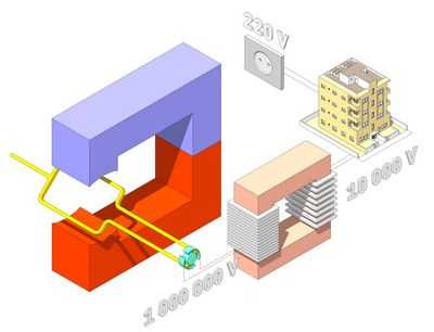 Переменный ток начинает свое движение от электрических станций, где имеются мощные генераторы, откуда он выходит с напряжением от 220 до 330 кВ. Далее переходит в трансформаторные подстанции, которые находятся вблизи домов, предприятий и остальных конструкций.