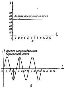 На рис. 2 графически изображены постоянный и переменный токи. В данном случае мы откладываем значения тока, причем вверх по вертикали от точки пересечения осей О откладываются значения тока одного направления, которое принято называть положительным, а вниз от этой точки — противоположного направления, которое принято называть отрицательным.