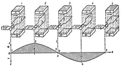 График учитывает изменение направления ЭДС тем, что кривая, изображающая ЭДС, пересекает ось времени и располагается теперь ниже этой оси. ЭДС возрастает опять-таки до тех пор, пока рамка не займет вертикальное положение. Затем начнется убывание ЭДС, и величина ее станет равной нулю, когда рамка вернется в свое первоначальное положение, совершив один полный оборот. На графике это выразится тем, что кривая ЭДС, достигнув в обратном направлении своей вершины (точка 4), встретится затем с осью времени (точка 5).