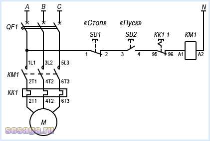 Фазы обозначены латинскими буквами A, B, C. Поскольку используется трёхфазное питание, контакты автоматического выключателя и контактора соединены механически для одновременного включения/отключения всех трёх фаз.