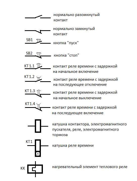 Символы по умолчанию находятся в предстартовом состоянии. С нормально замкнутым и разомкнутым контактом все ясно, буквенные обозначения им присваиваются по принадлежности к аппарату. Нормально замкнутый контакт еще называют размыкающим, а нормально разомкнутый — замыкающим. Трудности могут возникнуть с реле времени. Растолкую не по-научному.
