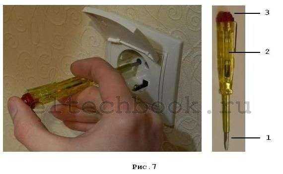 Для начала давайте рассмотрим как найти фазу. Проще всего это сделать индикаторной отверткой (рисунок 7).