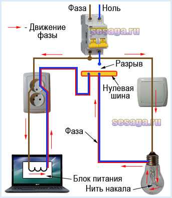 При отсутствии нуля все электрические приборы в доме работать не будут. Но если останется включенный в розетку хоть один бытовой прибор или останется включенный выключатель света, фаза через радиокомпоненты блока питания бытовой техники или нить накала лампы беспрепятственно пройдет на нулевую шину, а с шины на все нулевые провода электрической проводки. И как следствие, на обоих гнездах розеток и контактах выключателей будет присутствовать фаза. Это объясняется тем, что все нулевые провода электрической проводки соединяются вместе на нулевой шине.