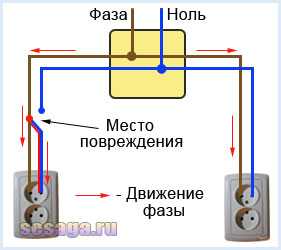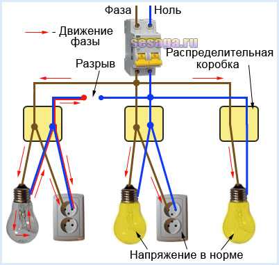 На рисунке выше видно, что перед левой распределительной коробкой произошел разрыв нулевой жилы провода, и фаза через нить накала лампы (нагрузку) попадает на розеточный ноль.