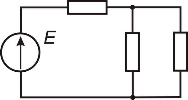 Рисунок 2 — Разветвленная цепьЭлектрические цепи подразделяют на неразветвленные и разветвленные. На рисунке 1 представлена схема простейшей неразветвленной цепи. Во всех элементах ее течет один и тот же ток. Простейшая разветвленная цепь изображена на рисунке 2. В ней имеются три ветви и два узла. В каждой ветви течет свой ток. Ветвь можно определить как участок цепи, образованный последовательно соединенными элементами (через которые течет одинаковый ток) и заключенный между двумя узлами. В свою очередь узел есть точка цепи, в которой сходятся не менее трех ветвей. Если в месте пересечения двух линий на электрической схеме поставлена точка (рисунок 2), то в этом месте есть электрическое соединение двух линий, в противном случае его нет. Узел, в котором сходятся две ветви, одна из которых является продолжением другой, называют устранимым или вырожденным узлом