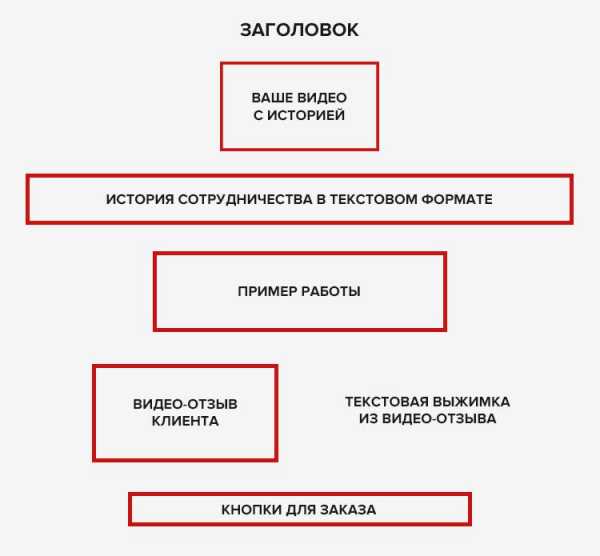 3 часть – видео-отзыв клиента с текстовой выжимкой. Текстовая выжимка – это тот ключевой кусок из отзыва, который в большей степени интересен для потенциального клиента. Обычно туда вставляют описание результата клиента.