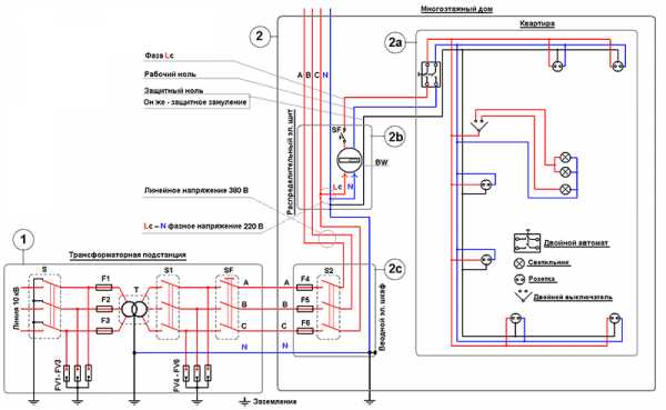 Таким образом, из подстанции выходят “фаза”, “ноль” и “земля”, идут в каждый подъезд (своя фаза в каждый подъезд, наверное), на каждую лестничную площадку, в электрораспределительные щитки.
