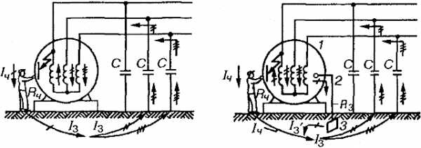 Рассмотрим случаи прикосновения человека к заземленному и незаземленному корпусу при однофазном коротком замыкании. Если произошел пробой изоляции на токопроводящую оболочку, не присоединенную к заземлению, то ток потечет по цепи: фаза на корпусе-человек – земля — сопротивление изоляции между двух других фаз и землей.