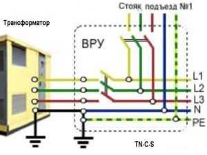 Мощный силовой кабель приходит в водный распределительный щит. С главного щита идет распределение по подъездам, а с подъезда по этажам, с этажей по квартирам. Трехфазная схема распределяется равномерно по этажам. Если в подъезде 36 квартир, три фазы будут распределены следующим образом: фаза А – 12 квартир, фаза В – 12 квартир, фаза С – 12 квартир. Распределено равномерно, для баланса работы трехфазной схемы.