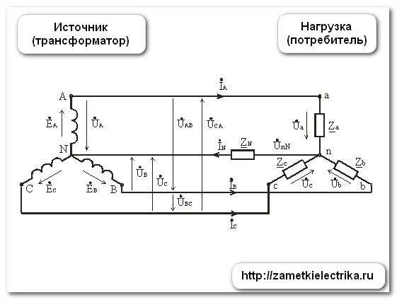 Благодаря назначению нулевого провода напряжение на каждой фазе нагрузки будет практически одинаковым при неравномерной нагрузке фаз. Осветительная нагрузка, включенная звездой, всегда требует наличия нулевого провода, так как равномерная нагрузка фаз не гарантируется.в э