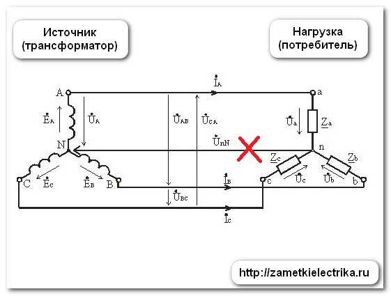 Нулевой провод предотвращает нежелательные ситуации при аварийных режимах работы. Без его наличия в случае фазного короткого замыкания двух фаз напряжение в третьей фазе мгновенно возрастет в √3 раз. Это губительно скажется на оборудовании, которое питает этот источник. В случае наличия нуля в такой ситуации, напряжение не изменится.