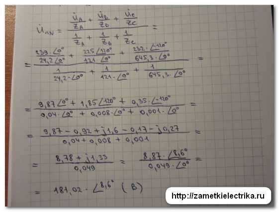 А чтобы понять, как именно распределятся фазные напряжения, сначала необходимо найти напряжение смещения нейтрали (по методу узловых напряжений).