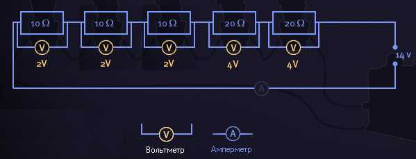 Вольтметр, в свою очередь, в разных точках показывает различные значения напряжения. Напряжение на отдельных лампочках суммируются в общее напряжение, равное 14 В. Это означает, что все потребители электрического тока должны делить эти 14 В между собой. Если мы, например, уберем из цепи 2 лампы с сопротивлением 20 Ом, то общее напряжение будет делиться на оставшиеся 3 лампы. Теперь на каждой лампе будет напряжение в 4,6 В.
