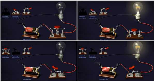 Переключатель одновременно размыкает одну электрическую цепь и замыкает другую. Кроме механических переключателей существуют электрические, которые называются реле.