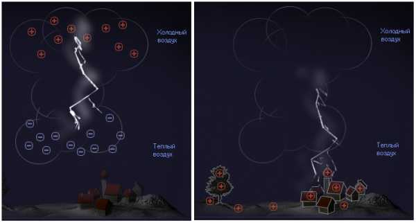 Потоки теплого воздуха переносят частички воды вверх. При этом происходит разделение зарядов — точно такое же, как при трении эбонитовой палочки о шелковый платок. Воздушные течения поднимают положительно заряженные частички в верхнюю часть облака, в то время как отрицательный заряд концентрируется в его нижней части.