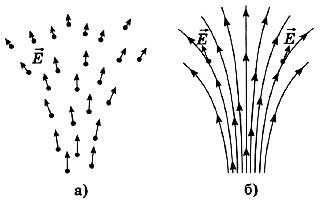Электрическое поле не действует на органы чувств. Его мы не видим. Однако мы можем получить некоторое представление о распределении поля, если нарисуем векторы напряжённости поля в нескольких точках пространства (рис. 14.9, а). Картина будет более наглядной, если нарисовать непрерывные линии.