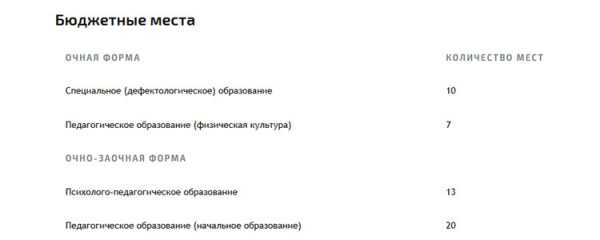 - количество мест для «очников» и «заочников» на каждую специальность