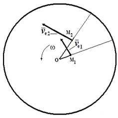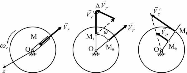 Рассмотрим, как изменяется переносная скорость в зависимости от относительного движения. В моменты времени t1 и t2 переносная скорость определяется выражениями νe1= ω × OM1 и νe2= ω × OM2. Тогда приращение вектора νe за счет относительного движения будет равно