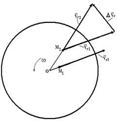 Пусть в момент времени t1 точка M занимала положение M1 и имела относительную скорость νr1. За промежуток времени Δt точка M переместится в положение M2, при этом направление скорости νr изменится вследствие вращения диска. Вектор νr получит приращение Δνr. Отношение Δνr/Δt определяет среднее ускорение точки за промежуток времени Δt. Предел отношения Δνr / Δt при Δt→ 0 есть производная dνr /dt, как производная от вектора постоянного по величине.