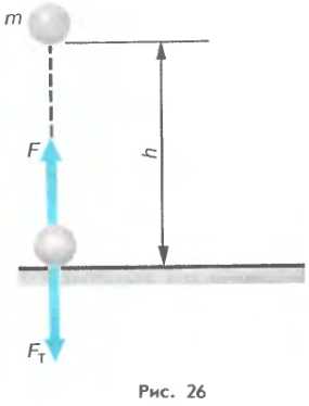 2. Потенциальная энергия. Найдем потенциальную энергию тела, взаимодействующего с Землей. Нулевым будем считать положение тела на поверхности Земли. Тогда потенциальная энергия тела, находящегося на некоторой высоте h, будет равна работе, необходимой для перемещения этого тела с поверхности Земли на заданную высоту. При равномерном подъеме, когда прикладываемая к телу сила совпадает по величине с силой тяжести (рис. 26), эта работа может быть найдена следующим образом: