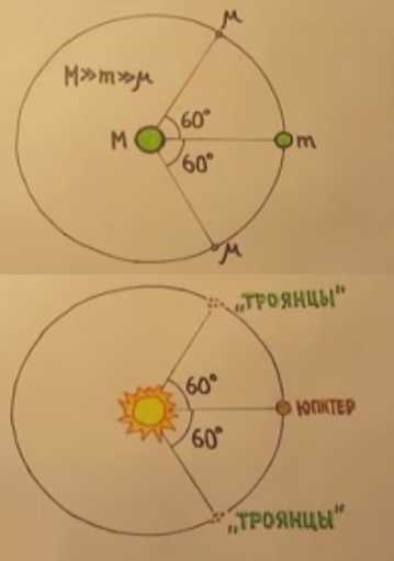 В своё время Лагранж, пытаясь решить задачу трёх тел, получил устойчивое решения для частного случая. Он показал, что третье тело может двигаться по орбите второго, всё время находясь в одной из двух точек, одна из которых опережает второе тело на 60°, а вторая на столько же отстаёт.