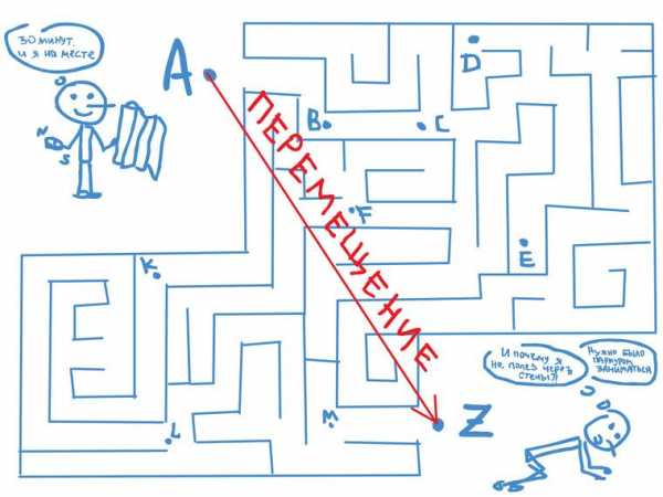 Представим человечка, который гуляет по лабиринту. Он может ходить по этому лабиринту хоть целый день и пройти десятки километров: поворачивать то направо, то налево, то возвращаться и проходить по одним и тем же дорожкам снова и снова, пока не найдет выход.