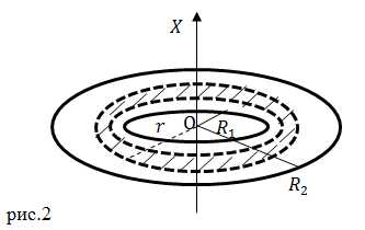 Разобьем это кольцо на тонкие кольца. Одно из таких колец показано на рис. 2 пунктиром, его радиус . Момент инерции этого кольца относительно оси X равен:
