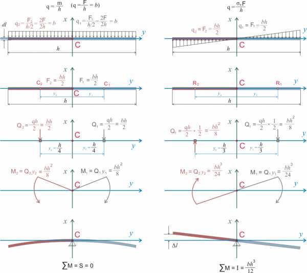 Рисунок 2. Наглядная разница между статическим моментом и моментом инерции. А теперь вернемся еще раз к кинематике движения. Если проводить аналогии между напряжениями, возникающими в поперечных сечениях строительных конструкций, и различными видами движения, то в центрально растягиваемых и центрально сжатых элементах возникают напряжения равномерные по всей площади сечения. Эти напряжения можно сравнить с действием некоторой силы на тело, при котором тело будет двигаться прямолинейно и поступательно. А самое интересное, это то, что поперечные сечения центрально-растянутых или центрально сжатых элементов действительно движутся, так как действующие напряжения вызывают деформации. И величину таких деформаций можно определить для любого поперечного сечения конструкции. Для этого достаточно знать значение действующих напряжений, длину элемента, площадь сечения и модуль упругости материала, из которого изготовлена конструкция. У изгибаемых элементов поперечные сечения также не остаются на месте, а перемещаются, при этом перемещение поперечных сечений изгибаемых элементов подобно вращению некоего тела относительно некоторой оси. Как вы уже наверное догадались, момент инерции позволяет определить и угол наклона поперечного сечения и перемещение Δl для крайних точек сечения. Эти крайние точки для прямоугольного сечения находятся на расстоянии, равном половине высоты сечения (почему – достаточно подробно описано в статье “Основы сопромата. Определенение прогиба” ). А это в свою очередь позволяет определить прогиб конструкции. А еще момент инерции позволяет определить момент сопротивления сечения. Для этого момент инерции нужно просто разделить на расстояние от центра тяжести сечения до наиболее удаленной точки сечения, для прямоугольного сечения на h/2. А так как исследуемые сечения не всегда симметричны, то значение момента сопротивления может быть разным для разных частей сечения. А началось все с банального яблока… хотя нет, начиналось все со слова. |