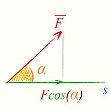 Если сила и перемещение составляют между собой угол α 90º, то перемещение следует умножать на составляющую силы в направлении перемещения (или силу умножать на составляющую перемещения в направлении действия силы). В векторной форме \[ W = \vect{F}·\vect{s} \] \[ W = F·s·\cos(α) \] Здесь: | ![]() |