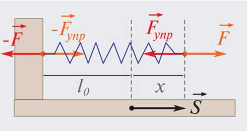 Рисунок 1.18.3. Растянутая пружина. Направление внешней силы совпадает с направлением перемещения : k – жесткость пружины.
