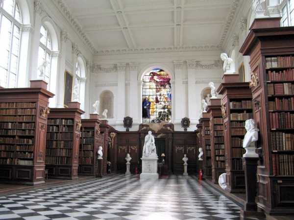 ΠΠΈΠ±Π»ΠΈΠΎΡΠ΅ΠΊΠ° ΠΊΠΎΠ»Π»Π΅Π΄ΠΆΠ° Π’ΡΠΈΠ½ΠΈΡΠΈ Π±ΡΠ»Π° ΡΠΏΡΠΎΠ΅ΠΊΡΠΈΡΠΎΠ²Π°Π½Π° ΠΡΠΈΡΡΠΎΡΠ΅ΡΠΎΠΌ Π Π΅Π½ΠΎΠΌ Π² 1676-ΠΌ Π³ΠΎΠ΄Ρ ΠΈ ΠΏΠΎΡΡΡΠΎΠ΅Π½Π° 19 Π»Π΅Ρ ΡΠΏΡΡΡΡ. ΠΠ½Π° ΡΠΎΡΡΠΎΠΈΡ ΠΈΠ· ΠΎΠ΄Π½ΠΎΠΉ Π³ΠΈΠ³Π°Π½ΡΡΠΊΠΎΠΉ ΠΊΠΎΠΌΠ½Π°ΡΡ. Π‘ΡΠΈΡΠ°Π΅ΡΡΡ, ΡΡΠΎ ΡΡΠΎ ΠΏΠ΅ΡΠ²Π°Ρ Π±ΠΈΠ±Π»ΠΈΠΎΡΠ΅ΠΊΠ° Ρ Π±ΠΎΠ»ΡΡΠΈΠΌΠΈ ΠΎΠΊΠ½Π°ΠΌΠΈ, ΡΡΠΎ ΠΎΠ±Π΅ΡΠΏΠ΅ΡΠΈΠ²Π°Π΅Ρ ΠΊΠΎΠΌΡΠΎΡΡΠ½ΡΡ ΠΎΡΠ²Π΅ΡΠ΅Π½Π½ΠΎΡΡΡ Π΄Π»Ρ ΡΡΠ΅Π½ΠΈΡ. ΠΠΎΠ»ΠΊΠΈ Π΄Π»Ρ ΠΊΠ½ΠΈΠ³ Π·Π΄Π΅ΡΡ ΡΠ°ΡΠΏΠΎΠ»ΠΎΠΆΠ΅Π½Ρ Π² ΠΏΡΠΎΠΌΠ΅ΠΆΡΡΠΊΠ°Ρ ΠΌΠ΅ΠΆΠ΄Ρ ΠΎΠΊΠ½Π°ΠΌΠΈ.